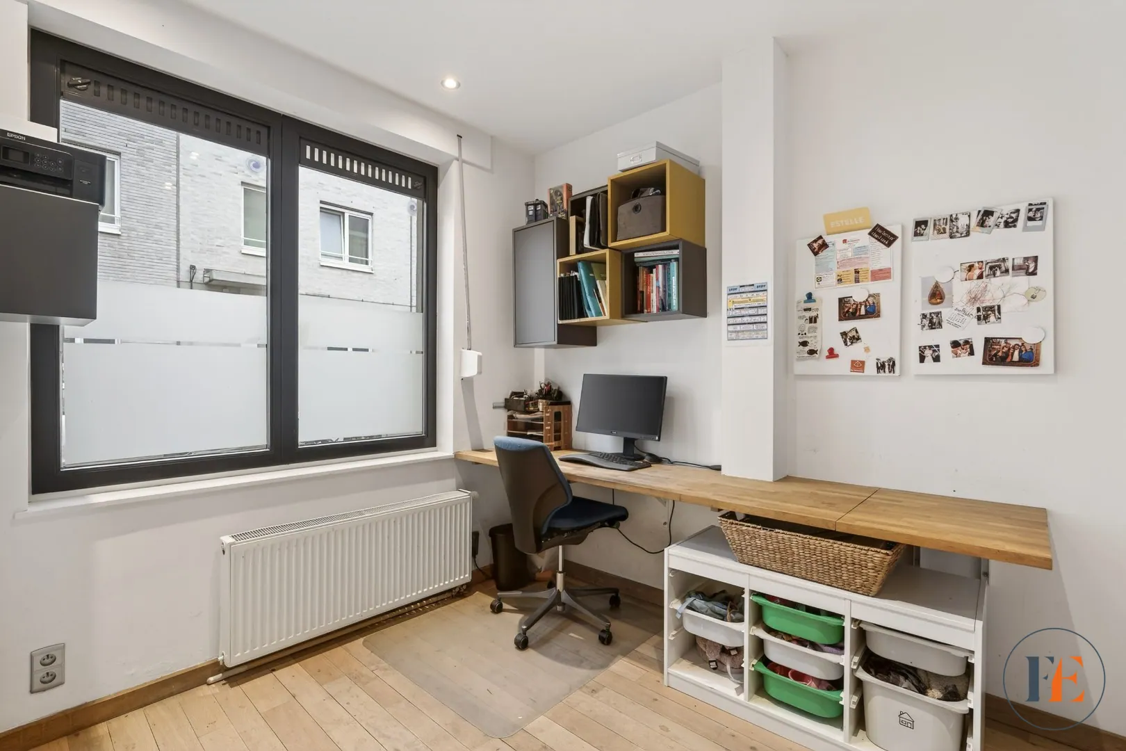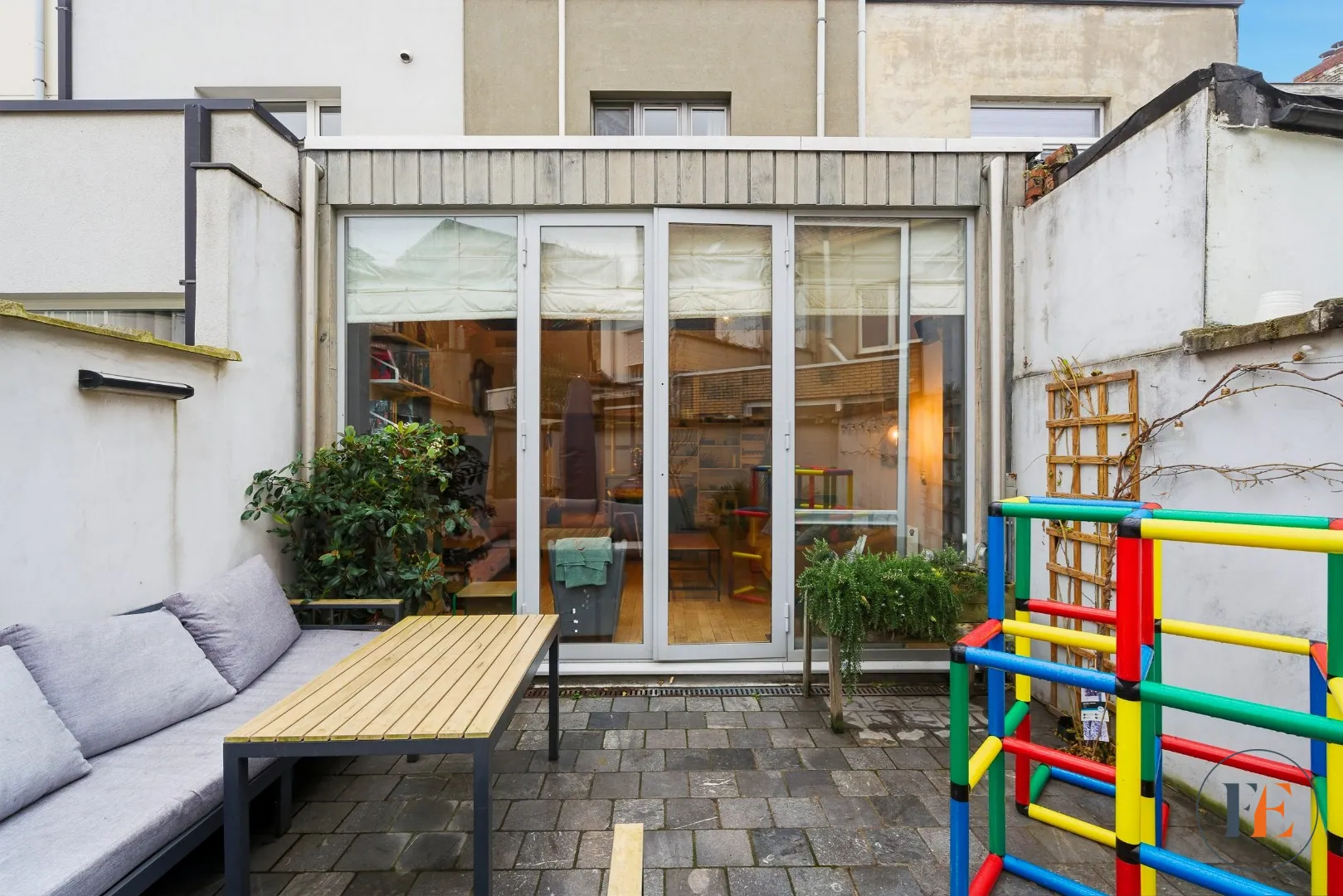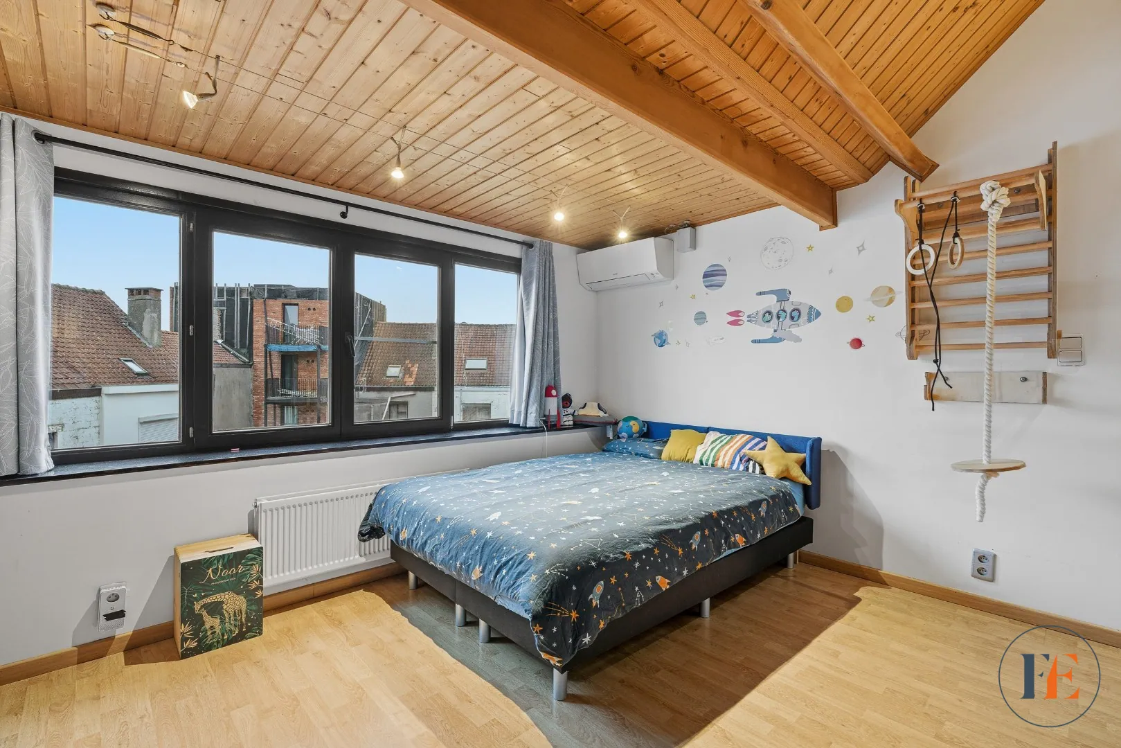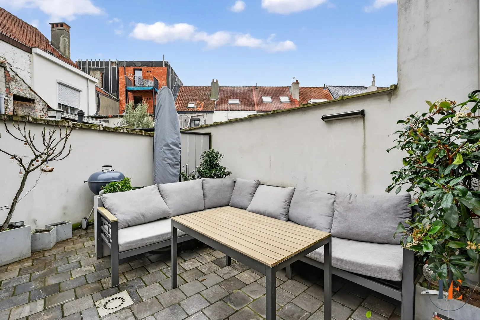 In de omgeving van de Rooigemlaan en de Bourgoyen bevindt zich dit aangename huis met kelder en koer. Op de benedenverdieping is erbij het binnenkomen van de woning een bureauruimte met toegang tot de kelder die praktisch werd ingericht met uitgietbak en aansluitingen voor wasmachine en droogkast. Verder is er een volledig ingerichte open keuken met alle voorzieningen, een eetplaats en salon die uitkijken op de gezellige buitenruimte. Hier is voldoende plaats om met het gezin te genieten van een drankje en/of een bbq te organiseren tijdens de zomermaanden. Beneden ligt er overal parket houten vloer. Via de trap tussen de keuken en het bureau komen we op de eerste verdieping: hier treffen we de master bedroom met airco, een apart toilet op de gang en de zeer ruime badkamer met inloopdouche en dubbele lavabo. De tweede verdieping voorziet twee ruime slaapkamers waar eveneens airconditioning is en een mezzanine om extra gerief of speelgoed van de kinderen op te bergen. Een extra troef van deze energiezuinige woning zijn de 8 zonnepanelen die aanwezig zijn.